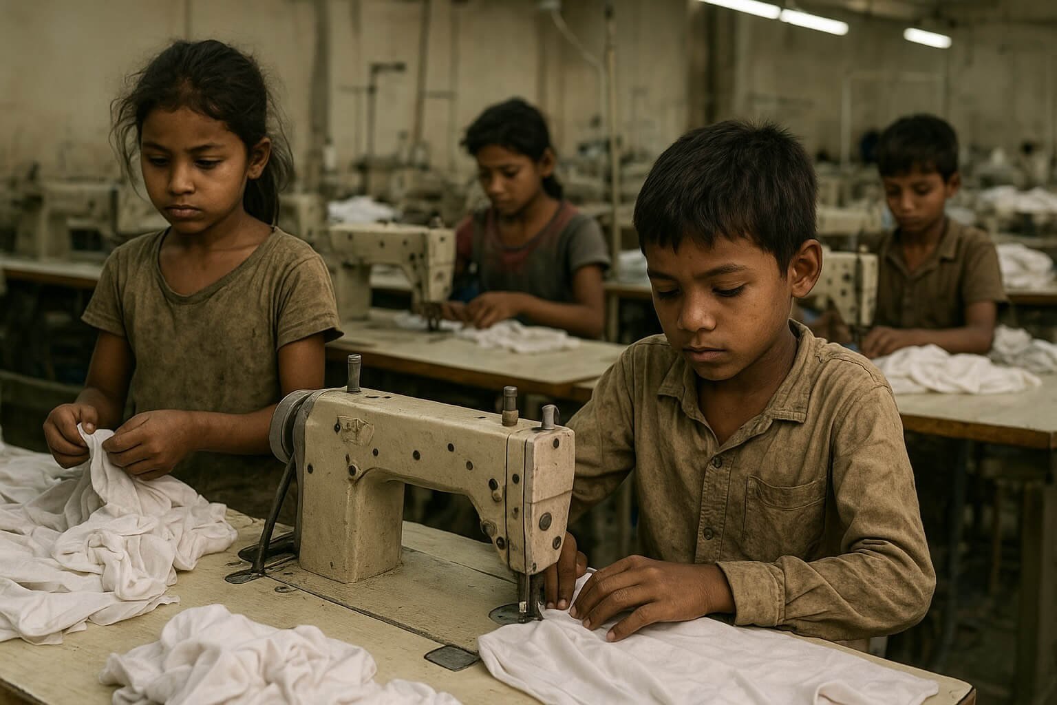 يأتي العديد من عمال المصانع البالغ عددهم 5 ملايين من المناطق التي لا يكون فيها الذهاب إلى المدرسة خياراً إلزامياً في سنوات التعليم الأولى. وفي الحقيقة، فإن نصف هذا العدد تقريباً لم يرتد المدرسة أبداً. البعض منهم يعمل على آلات الخياطة الضخمة، والبعض الآخر يقوم بتزيين أطراف الفساتين ب”الترتر”، والراتب الذي يحصلون عليه لا يتعدى 39 دولاراً شهرياً، وفي حالة العمل المتواصل على مدار 12 ساعة يمكن لطفل واحد خياطة ما متوسطه 1400 قميص في الشهر.