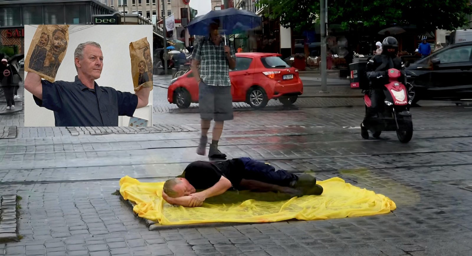 جاء العرض الأدائي للفنان ستامبه بعنوان (سرير المسيح)، في جو ماطر وبارد، وتميّز بقطعة قماش صفراء كبيرة، حلَّت محل سرير وسط زحام المرور في ساعات الذروة التي تشهدها مدينة غوتنبرغ عادة. يقول الفنان يواكيم ستامبه في معرض تعليقه على عرضه الأدائي المبهر إنني “كنت أحرك جسدي في عكس الحركة، حتى أصبح السرير المفترض مكاناً للراحة وسط ضجيج المدينة، وفعل سكون مضاد في أكثر الأماكن ازدحاماً في المدينة. كانت الحركو بسيطة، ولكنها غنية بالمعاني. الاستلقاء حيث لايسمح للمرء بالاستلقاء، وتدبير مكان حيث لايبدو أنه مكان واقعي. بهذه الطريقة أعتقد أنني صنعت صدعاً في مجرى الحياة اليومية وطرحت سؤالاً حول ماهية المدينة بالفعل؟”.